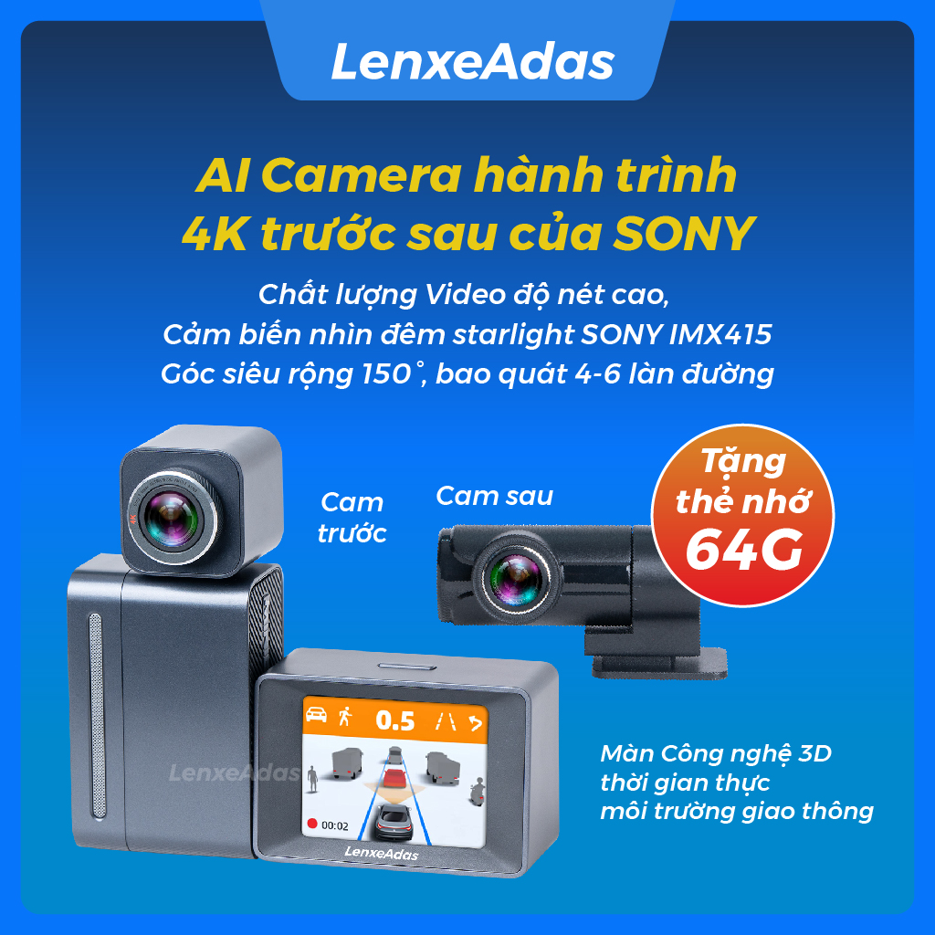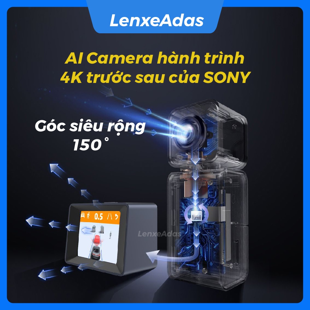LenxeAdas Minieye AI Camera hành trình 4k trước sau Sony, ADAS cảnh báo tiền va chạm, chệch làn đường, màn 3D thực tế giao thông